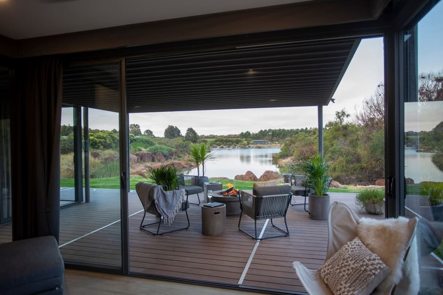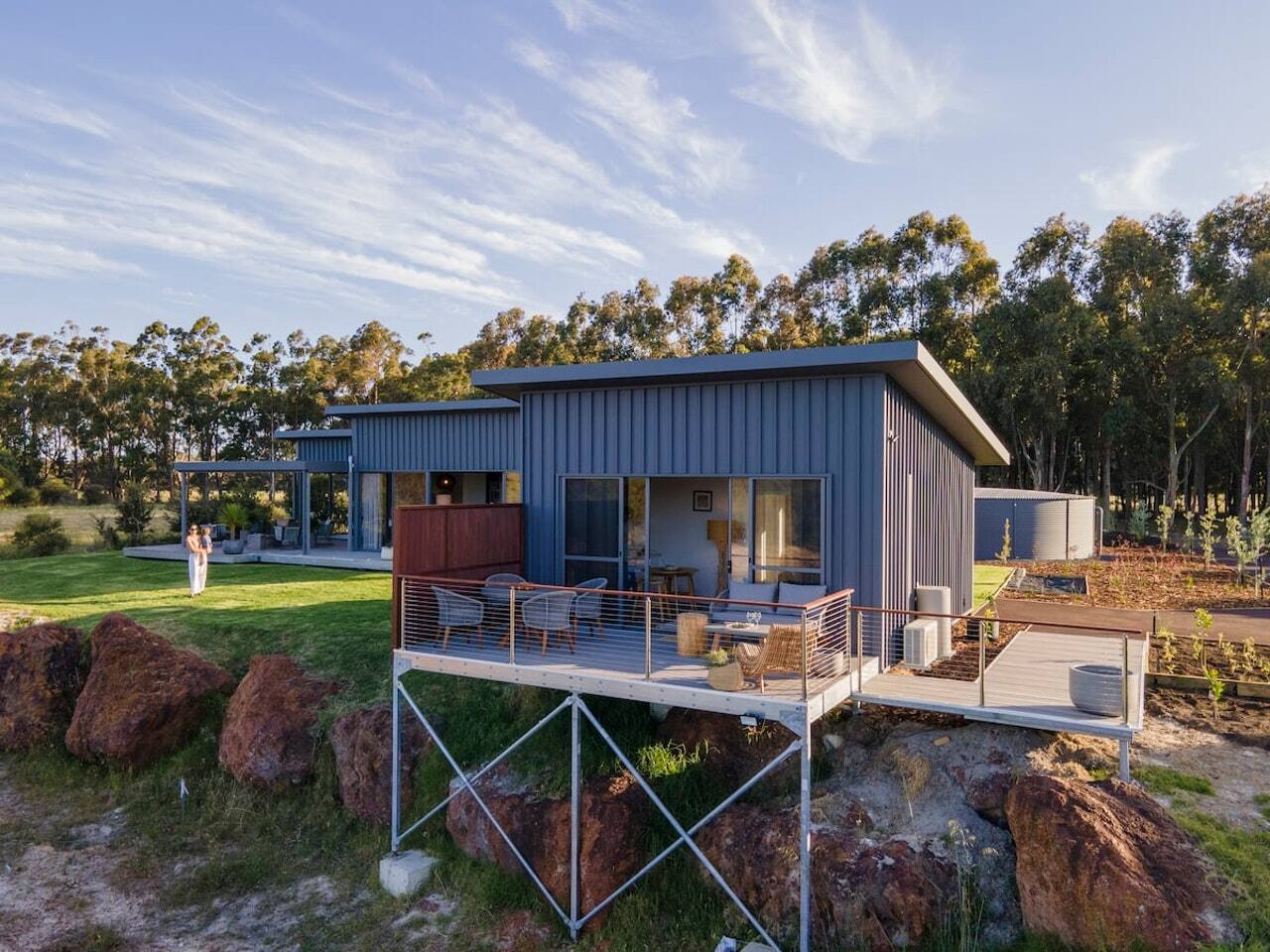 We offer this modern lodge 2 bedroom, 2 bathroom house situated off Caves Road with all fixtures and fittings for a comfortable holiday for you and/or your family. It has 2 Queen beds one in each bedroom and 2 single sofa beds. It has a touch of wild foliage and almost a north-west tumbleweed, rocky outcrop feel against a gentle south west sky. The one bedroom is detached from the main living space, a note for families with small children!